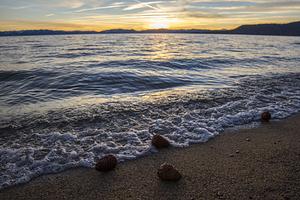Four pine cones washed up on the north shore of Lake Tahoe during sunset.