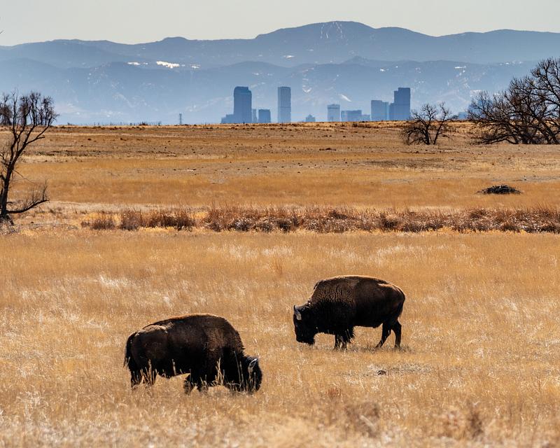 Bison grazing at the Rocky Mountain Arsenal National Wildlife Refuge in Denver, CO.