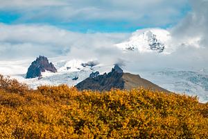 Vatnajökull Glacier shows its impressive beauty with fall colors in the foreground.